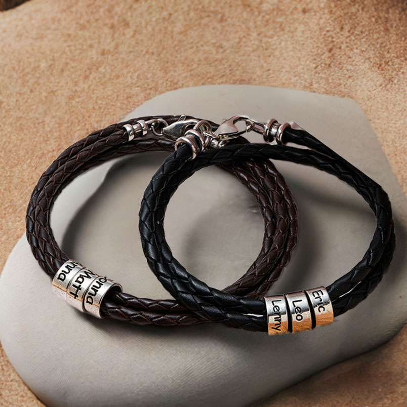 De gevlochten zwarte leren armband voor heren met kleine gepersonaliseerde zilveren kralen is dankzij stijlvolle details visueel bijzonder aantrekkelijk. Deze gepersonaliseerde armband heeft een soepele band uit gevlochten zwart leer, en wordt gepersonaliseerd met maximaal zeven kralen, elk met een eigen opschrift. Een stevige sluiting zorgt ervoor dat de armband mooi past en veilig zit.